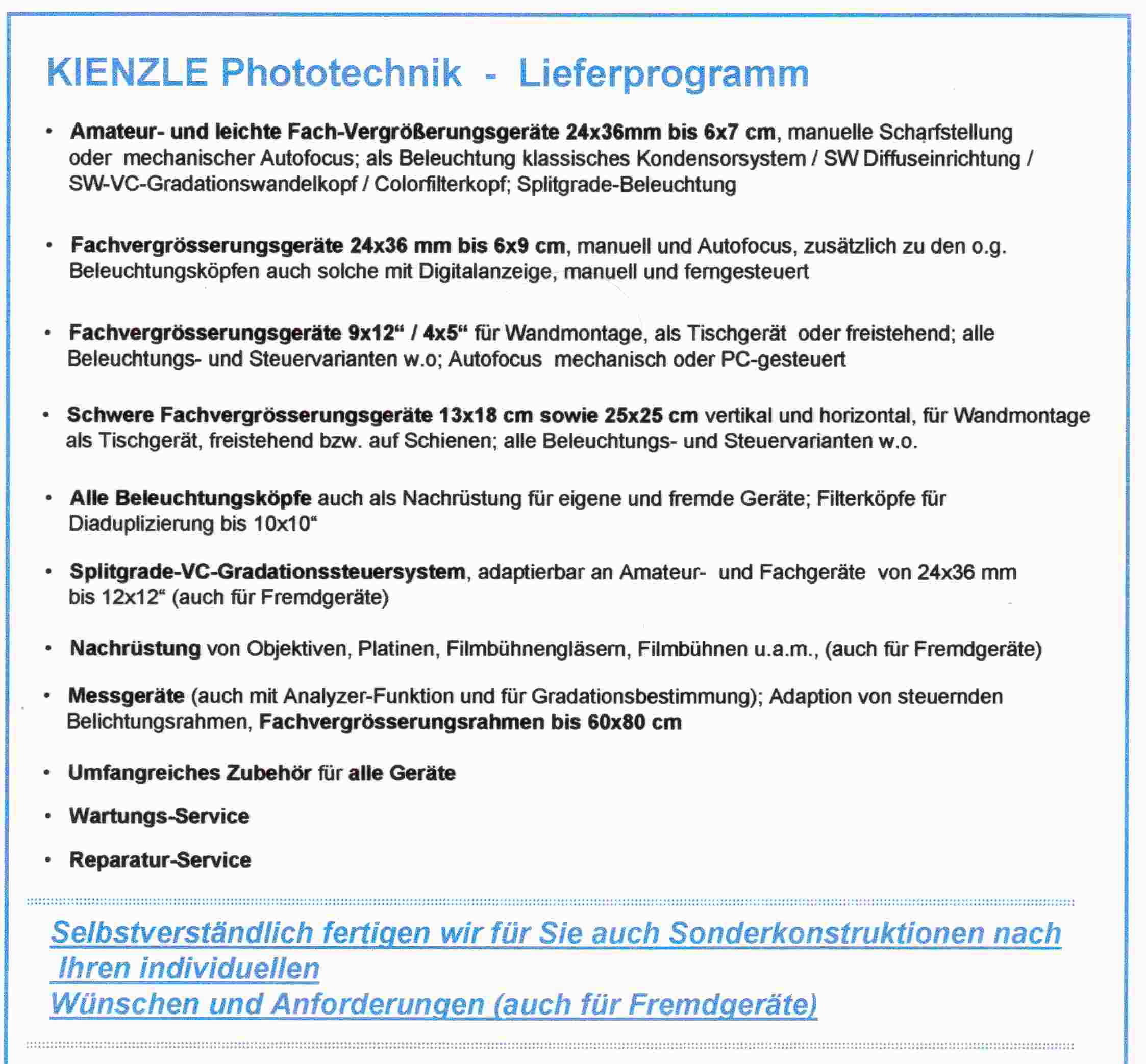 Die Homepage von Kienzle gibt noch detaillierte Auskünft: www.kienzle-phototechnik.de